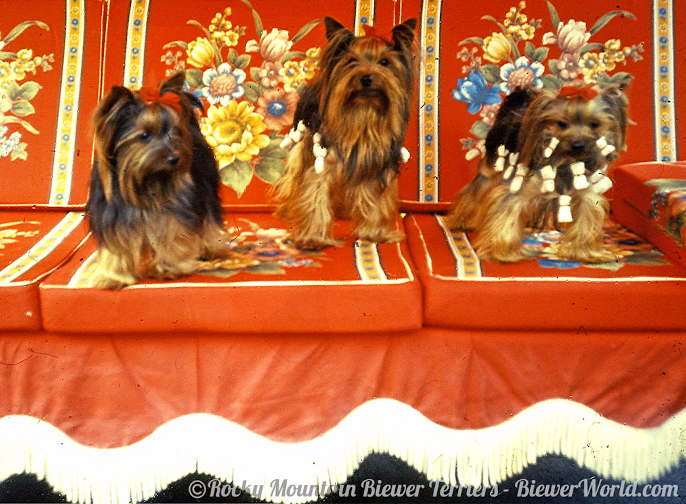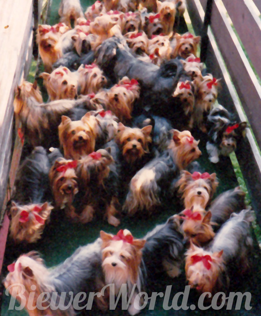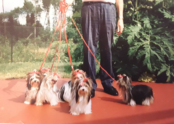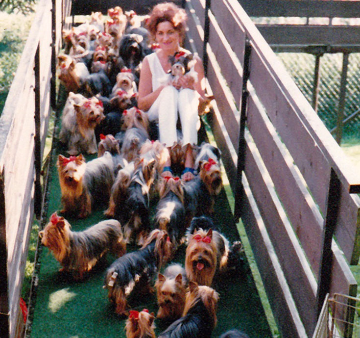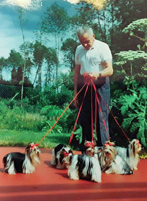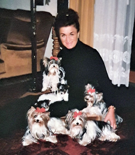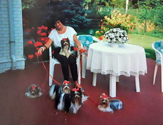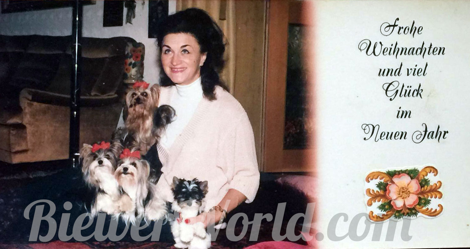The “Salon Biewer” in Cologne was sold to one of the employees and Werner and Gertrud started raising Yorkshire Terriers in Hirschfeld, full time, at their Yorkshire Terrier Kennel “Friedhecck”. They traveled a lot and showed their dogs and won many titles and awards. Gertrud often went to London, to buy Yorkie Puppies from the Streamglen. She did not speak any English but her sister Anneliese who worked on a Military base spoke a little bit, so they always went together. They smuggled puppies for their breeding program under the seat into Germany. Monika remembered in 1973, when her aunt Geertrud came home from London, with a super cute and tiny Yorkshire Terrier male. His name was Stremglen Richard and he cost over $15,000. This little Richard was FruFru’s grandfather on both sides. He was also Darling’s grandfather on both sides. FruFru von Friedheck and Darling von Friedheck then had the very first 3-colored Yorkie puppy, born in 1984 in the Friedheck Kennel in Hirschfeld.